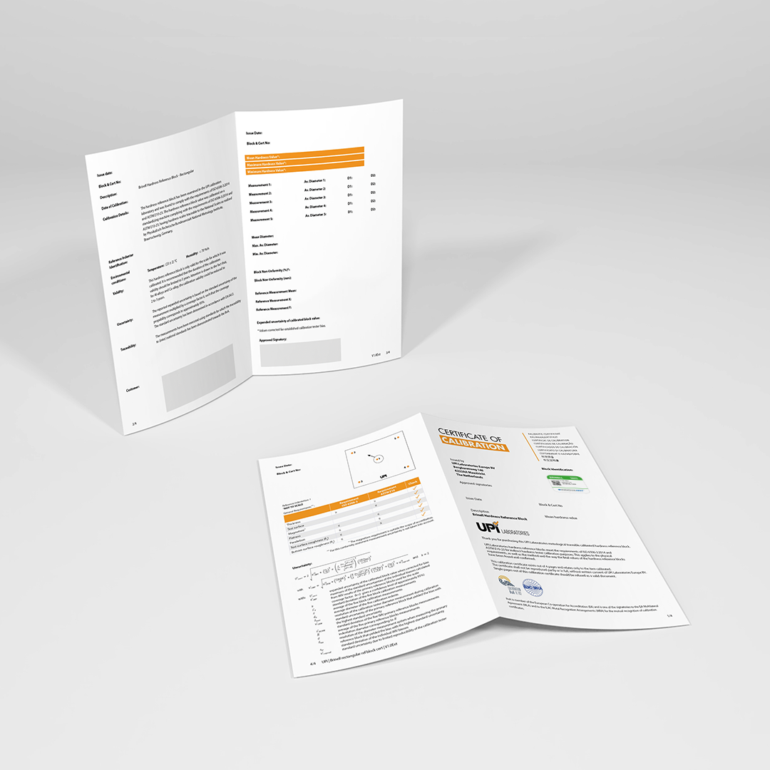 INNOVATEST Brinell hardness calibration blocks are calibrated & DUAL-certified by UPI Laboratories, accredited by the Dutch National Board of Accreditation and are traceable to National/International standards according to ISO 6506/3 & ASTM-E10 A4.