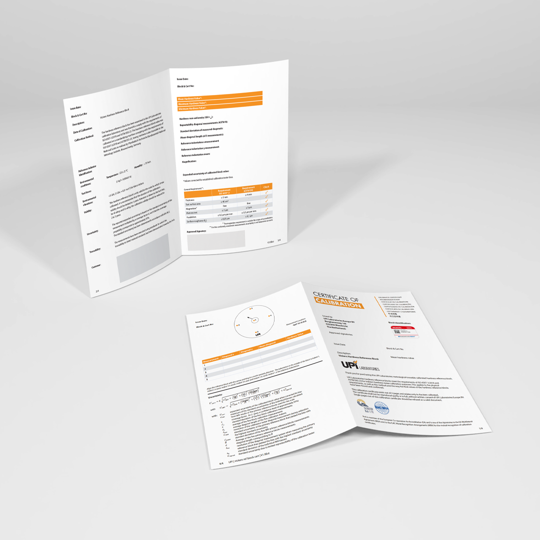 INNOVATEST Vickers hardness calibration blocks are calibrated & DUAL-certified by UPI Laboratories Europe BV traceable to National/International standards according to ISO 6507/3 & ASTM-E92 A4.
